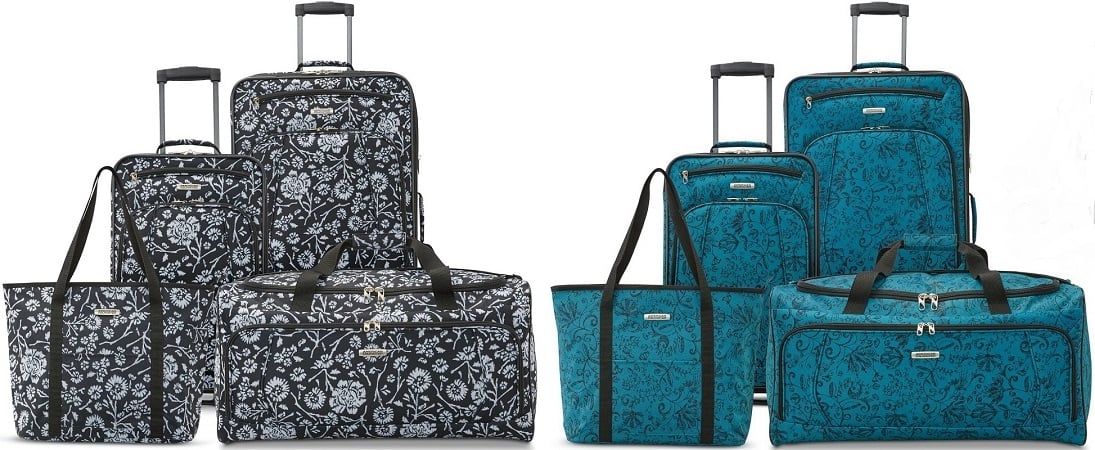 You'll choose from 2 different patterns/color – each set features a 27″ four-wheeled spinner, a 20″ two-wheeled upright, a duffel bag, and a shopper's tote. Shipping is Free! Click here to snag this deal.