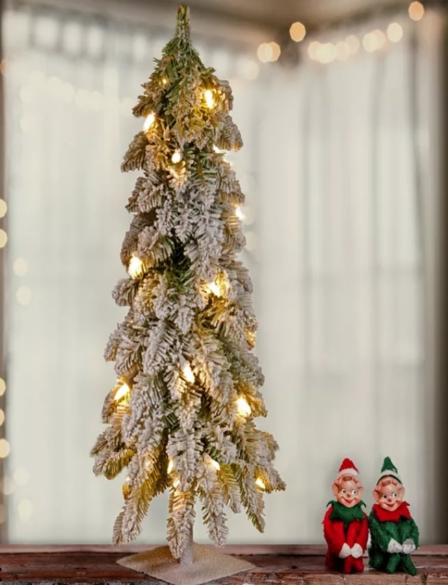 This tabletop tree is perfect for entry tables, desks, or small spaces that still deserve holiday cheer. The snowy finish adds a wintery touch without going full flocked.