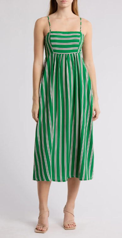 This striped midi dress feels easy and wearable. The babydoll shape keeps it relaxed. The stripe pattern makes it look pulled together. Nordstrom Rack lists it from $22.48 to $44.97, with up to 71% off select items. Comparable value is $79.50. That is strong dress math.