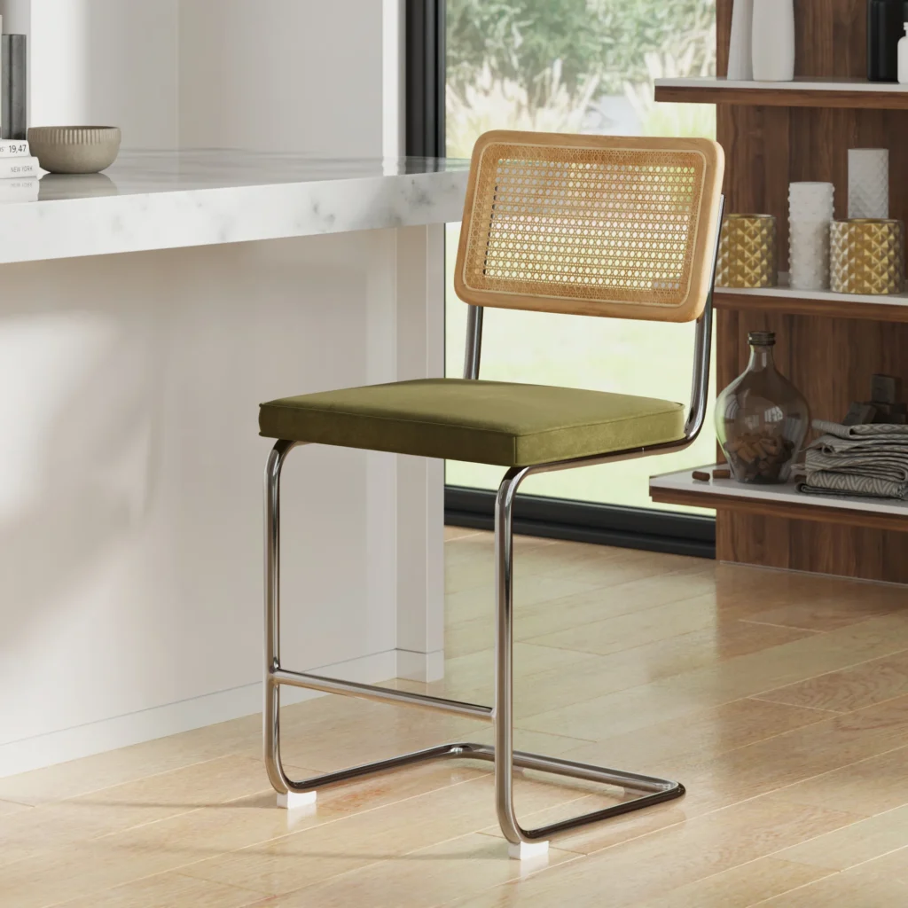 This set gives modern dining energy fast. Velvet plus cane looks high end.