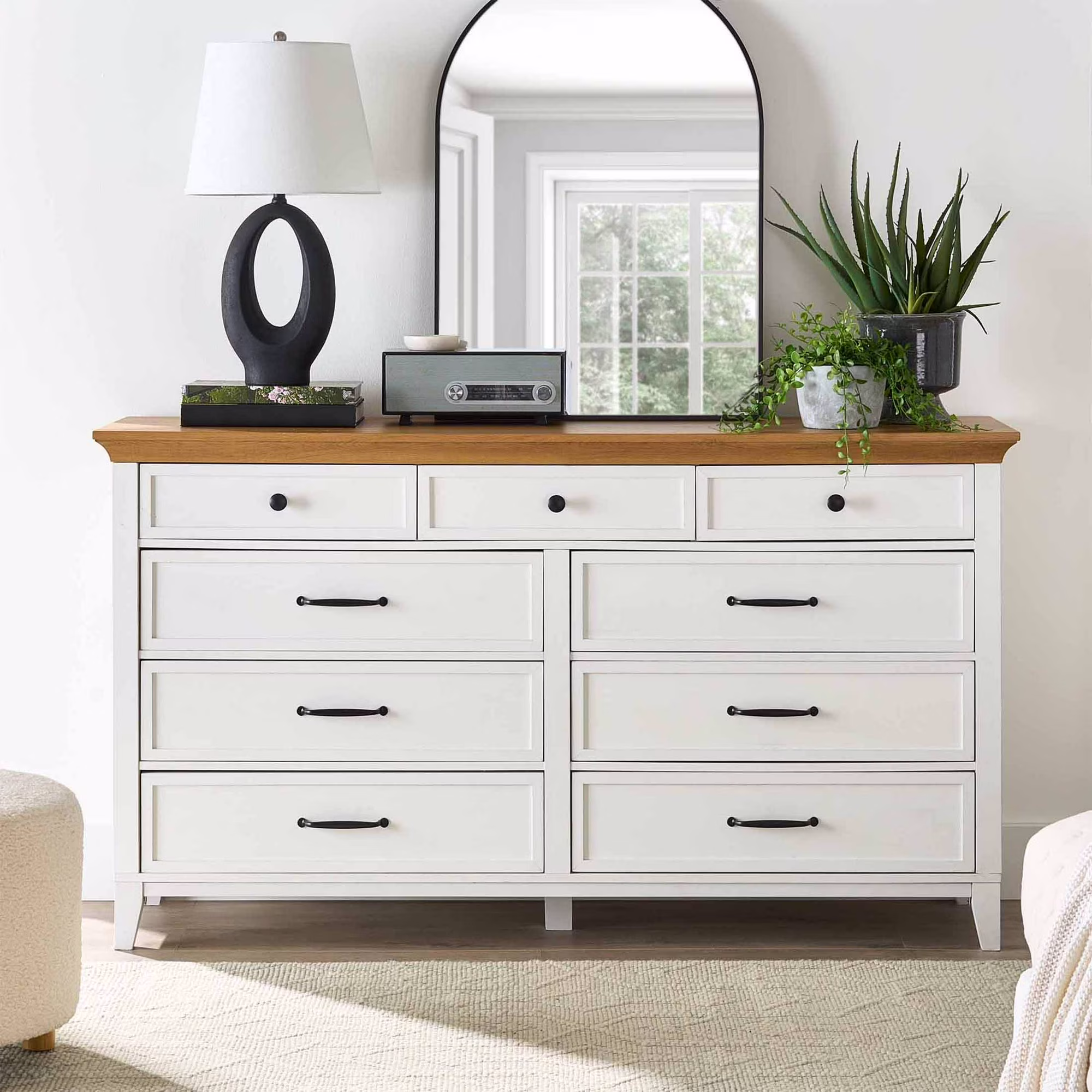If storage is the real problem, this dresser is the stronger play. It has nine drawers, a wide top surface, and a textured white and light honey finish that coordinates nicely with the bed. Walmart says it can also work as a TV stand for up to a 50-inch TV, so it is not locked into one job forever. That kind of flexibility matters when furniture needs to earn its keep.