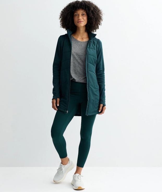This is a smart grab for errands and walks. It has a lightweight quilted feel. It also has stretch panels for easier movement.